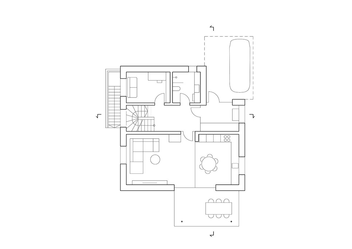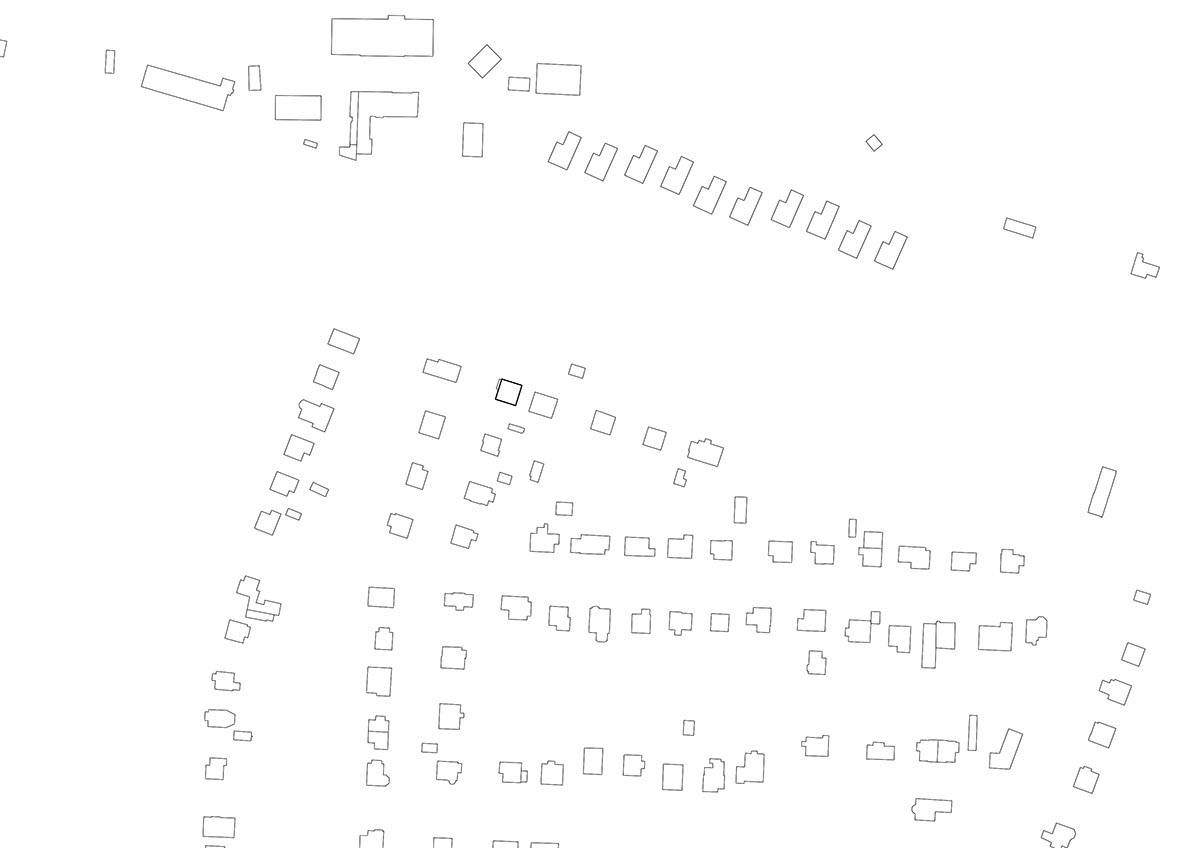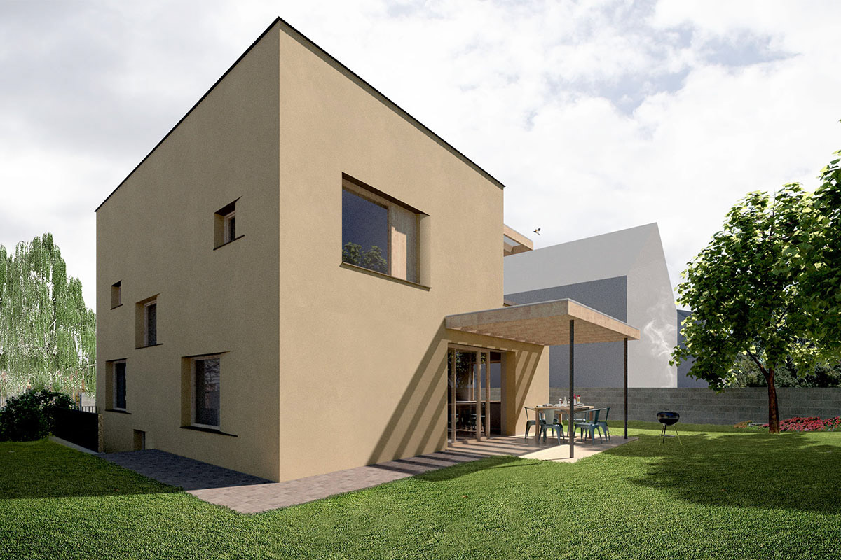 Umístění rodinného domu se téměř shoduje s půdorysnou stopou původní stavby z roku 1955. Určující pro hmotu domu jsou širší vztahy a nárožní pozice stavby v uliční řadě. Dům respektuje uliční čáry z obou směrů a svou plnou nečleněnou hmotou ji dále zvýrazňuje a upevňuje. Strohá architektura domu do ulice s rozdílným měřítkem okenních otvorů reflektuje negativní vlivy okolí, členění a jasná orientace směrem do zahrady je patrná z jižní a východní strany.