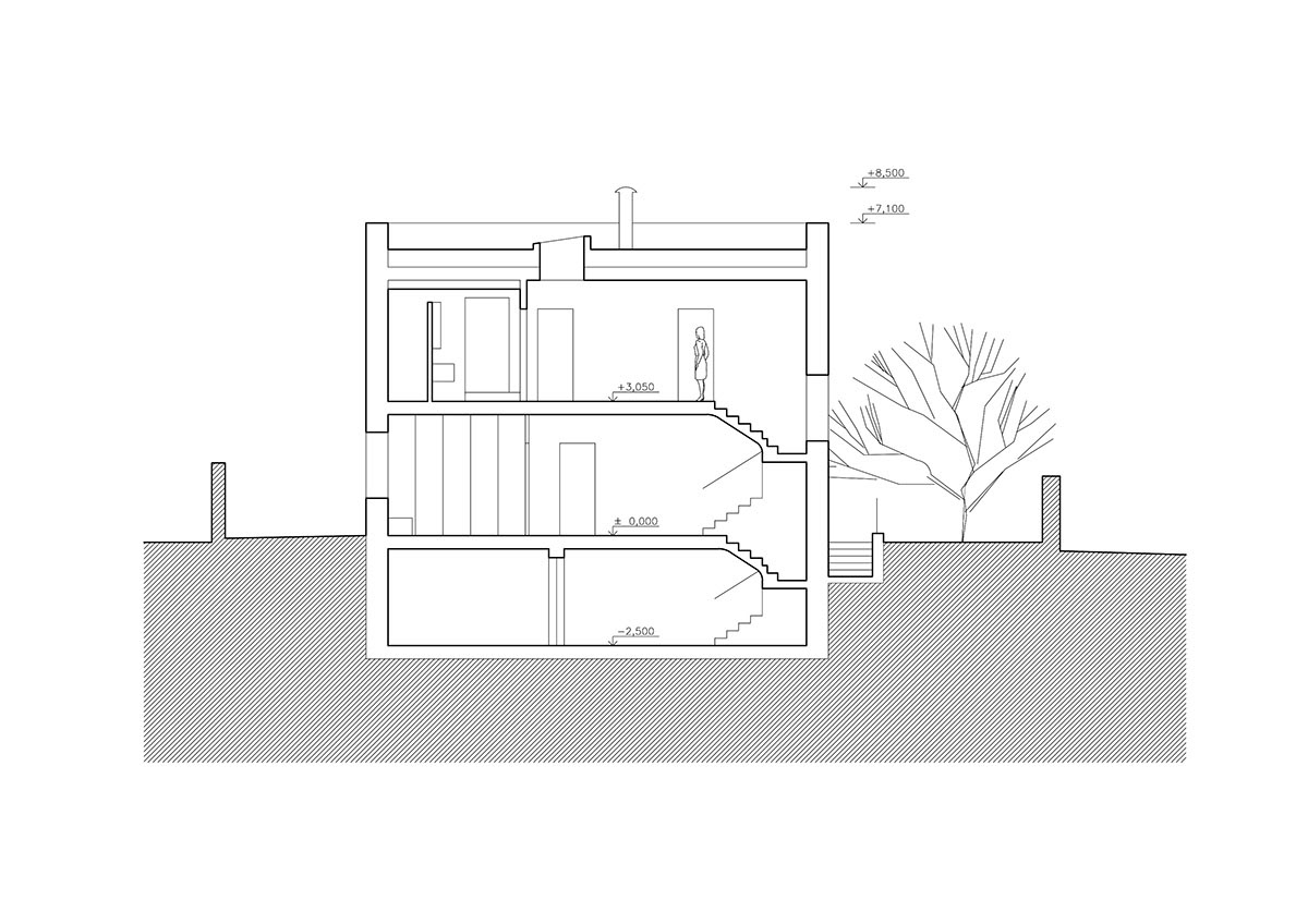 Vstup na pozemek zůstává stávající, orientovaný na severní stranu, z ulice Nad Nádražím. Dům respektuje uliční čáry i stopu původního domu. Jeho kompaktní tvar na půdoryse 10.5 x 10.5 m umožňuje využívat orientace obytného prostoru a teras na jižní stranu do zahrady. Parkování dvou vozidel je řešeno na pozemku na zpevněné ploše. Jedno parkovací stání je kryté. Hlavní vstup do domu je na severní straně pod ustoupeným přízemím, na západní straně je technický vstup v úrovni 1 PP. Výstup do zahrady je možný přes velkorysý otvor na jižní fasádě mezi obytným prostorem a krytou terasou.