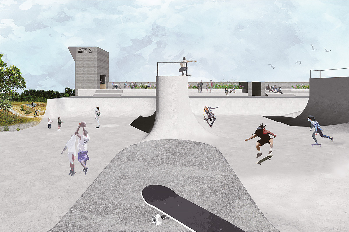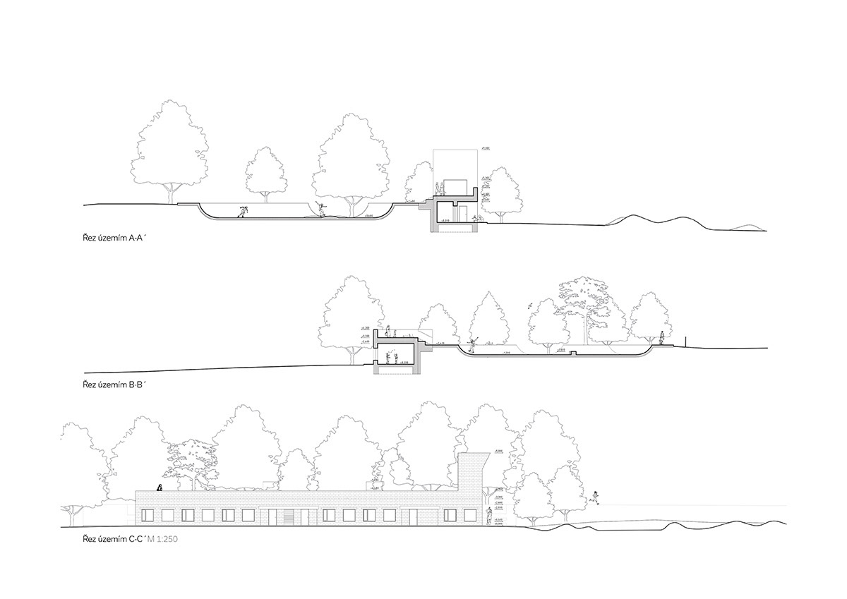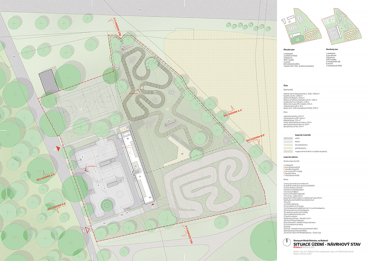 Při řešení areálu jsme zohlednili pouze nároky na něj kladené a požadovaný stavební program, současným uspořádáním jsme se neomezovali. Navrhli jsme řešení, které považujeme za nejlepší možné jak z hlediska užívání, tak z hlediska architektury a ekonomiky provozu. Zohlednili jsme přístupovou cestu z horní (západní) části areálu a při ní situovali skatepark formou betonové