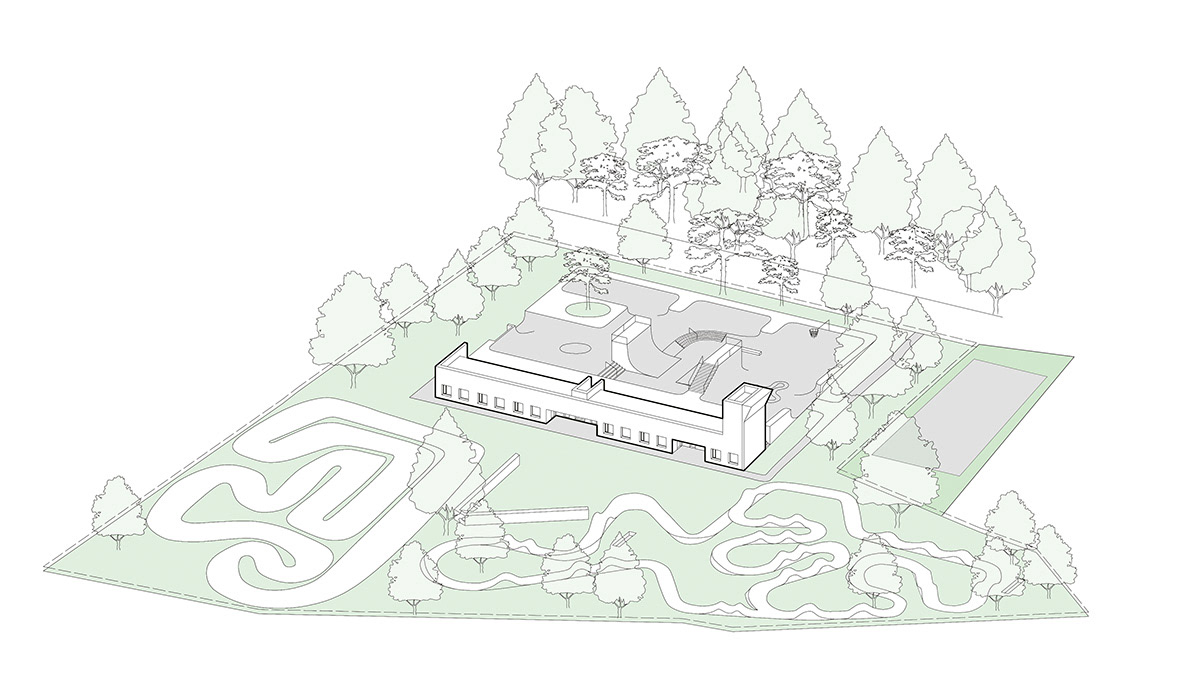 vany. Ve střední části se nachází dům, který zakončuje horní zpevněnou část a odděluje tak spodní část, která je spíše krajinného charakteru. Domem zastavěná plocha je srovnatelná se současnými klubovnami. U jihozápadního rohu jsme umístili vjezd pro vozidlo správce nebo údržby.